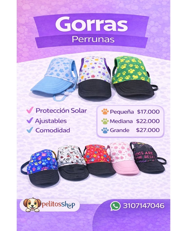 Con visera para protección solar, diseño ajustable y ajuste cómodo. Disponibles en varios colores y estampados, ideales para paseos al aire libre con estilo y seguridad. ☀️🐾